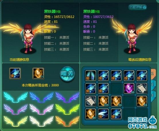分别在“翅膀”和“宝石碎片”栏里放入要喂养的翅膀和宝石碎片,点击喂养,就可以增加翅膀的灵性,每次喂养增加的灵性与宝石碎片的等级有关。