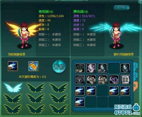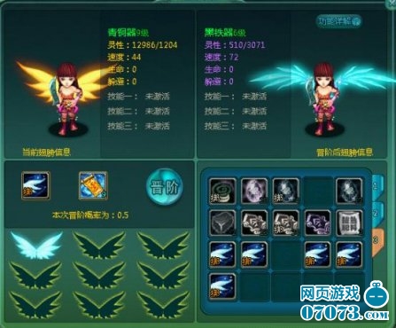 分别在“翅膀”和“晋阶道具”栏里放入要晋阶的翅膀和晋阶道具(晋阶神符),点击晋阶即可。每次晋阶需要消耗一定数量的晋阶神符,且有一定的失败几率。