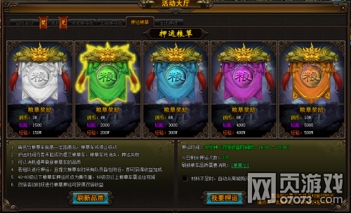 1、可以消耗“粮草令”刷新粮草车品质,粮草车品质由低到高为白、绿、蓝、紫、橙,点击刷新品质后将随机刷新到其中一种
