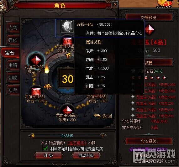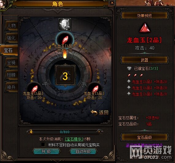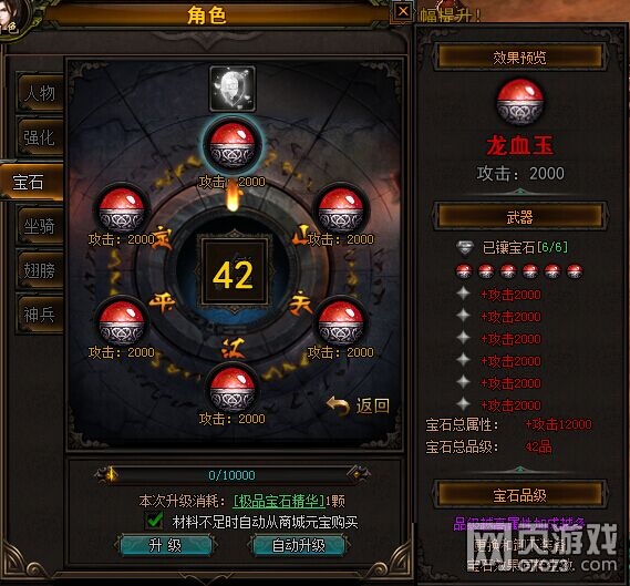 “升级”即是玩家手动升级,只要升级材料足够,就可以鼠标点击升级按钮进行升级,若宝石升级材料不足,则可以使用元宝代替。