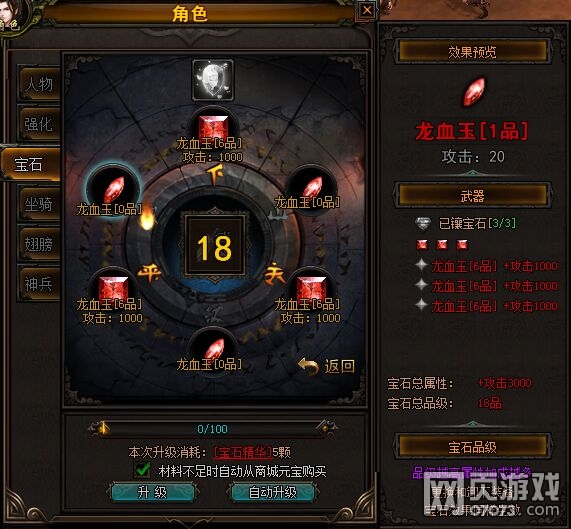 在宝石升级面板中,会有“升级”和“自动升级”2种升级方式。