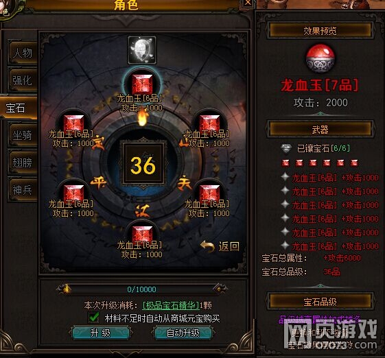 当6颗宝石均升级到6品时,即可使用极品宝石精华将其直接提升至7品。