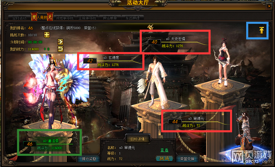红色框体为排在您前面的玩家角色名和战斗力。点击蓝色框中的箭头可查看和挑战排名前三的玩家。