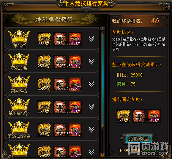 每个玩家每日可领取一次排名奖励。排名越高的,奖励自然越多!