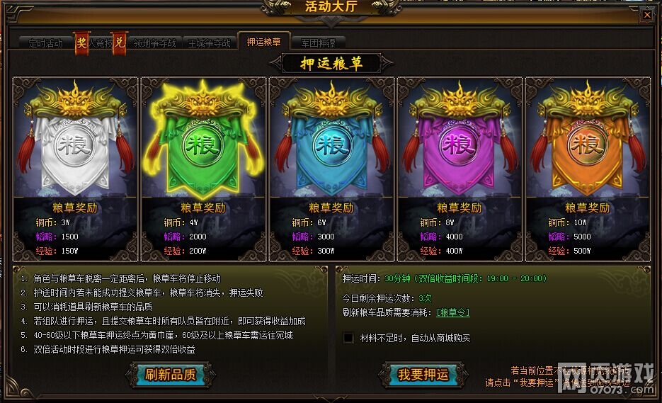 1、可以消耗“粮草令”刷新粮草车品质,粮草车品质由低到高为白、绿、蓝、紫、橙,点击刷新品质后将随机刷新到其中一种