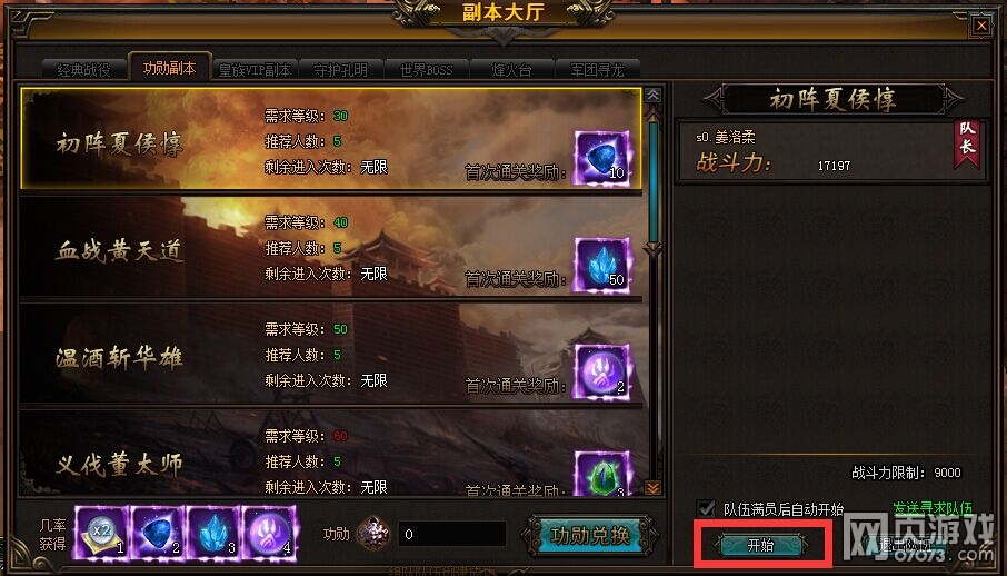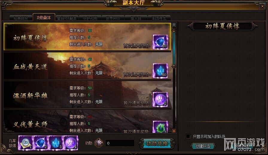 点击界面右上角的“副本大厅”即可打开副本界面,点击“功勋副本”,即可看到一场场惊心动魄的战役。