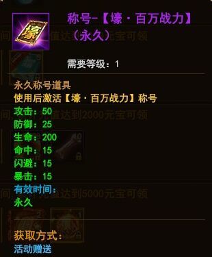“壕·百万战力”称号是需要我们在新服活动期间累计充值达到500元宝(即50元)才能领取的,领取后可为我们增加的属性数值如下: