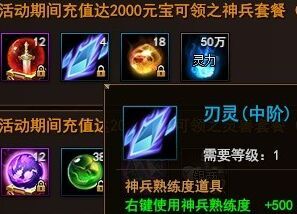 2.使用刃灵快速增加神兵熟练度,刃灵主要通过充值活动获得。