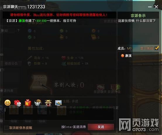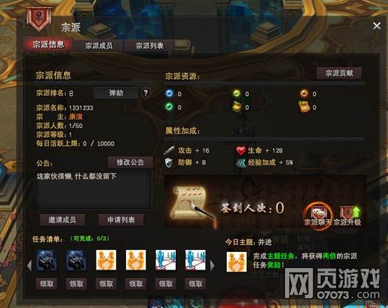 加入宗派之后,玩家就可以打开宗派信息界面了,在这个界面中玩家可以查看自己当前的宗派信息,修改宗派公告,进行宗派签到,