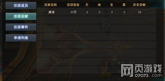 在此界面中玩家可进行宗派资源捐献,还可查看自己的历史贡献,宗派资源用于宗派升级。
