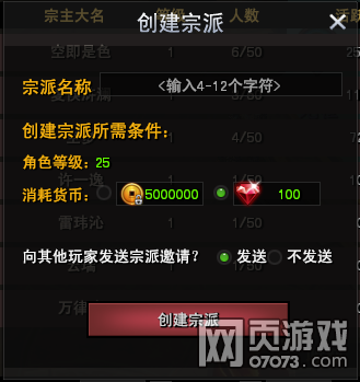 玩家点击“创建宗派”按钮会打开创建宗派界面,在这个界面中,需要玩家输入宗派名称,还需要玩家身上拥有足够的货币,还可设置是否向其他玩家发送宗派邀请。