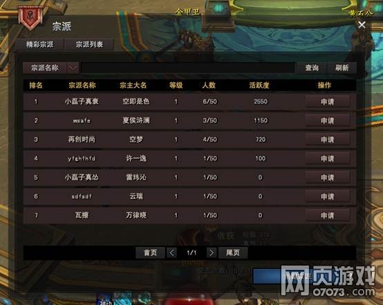 玩家点击“创建/加入宗派”按钮后,会将页面跳转到宗派列表界面中,玩家可以在这个界面中查看其他玩家创建的宗派,并可申请加入其中。