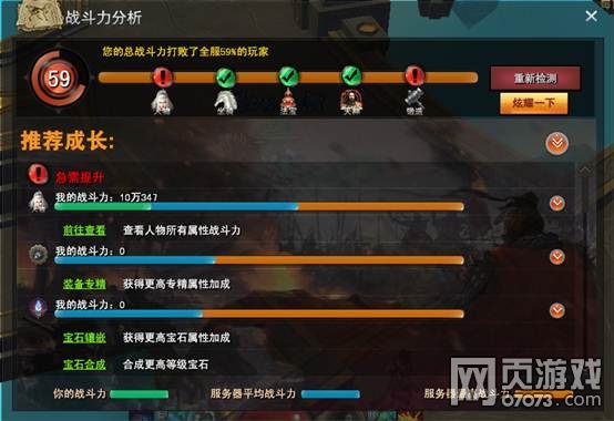 刚接触游戏时很多玩家可能都不清楚该如何增强自身的实力,为了玩家更加方便的了解,我们在游戏中推出了战斗力分析系统。通过点击主界面头像旁边的放大镜