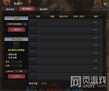 游戏特色交易系统,玩家可以我的摊位来上架物品、银两、元宝。