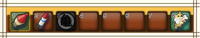 下方中间的工具栏是武器栏,玩家可以方便的切换战斗武器。前7格是玩家自己购买的武器,最后一格是宠物的特殊技能。其中“怒气类”的武器一定要怒气槽满后才可以使用。