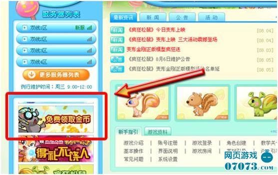 首先,在疯狂松鼠官网的左侧广告位置处,找到“免费领取金币”的滚动广告进行点击,或者直接打开如下网址,即可进入到做任务免费领取金币的活动页面。