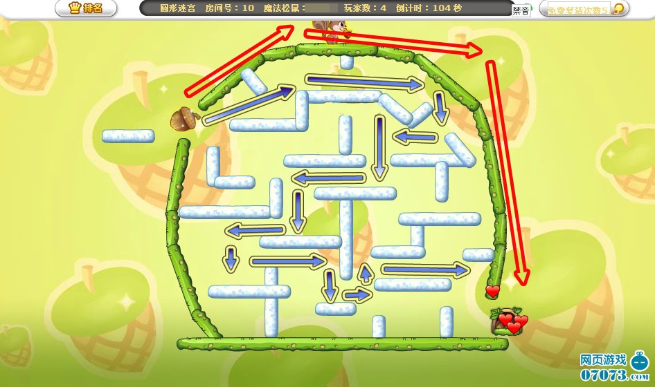 图中的蓝色箭头是脱离迷宫的正确路线,但是想要取得好成绩,正确的路线却并不代表着最好的选择,这个时候应该参考红色箭头的所指向的捷径,才是获得胜利的最佳推荐。