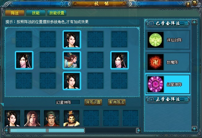点击已经学会的阵法,可以看到发亮的阵位,将主角和护法拖放到发亮的阵位,即可激活阵法。