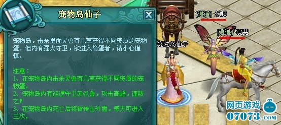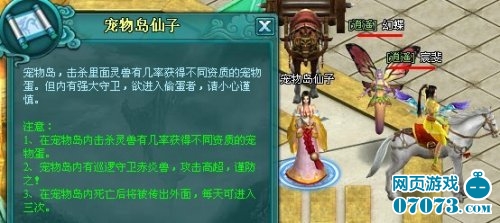 除此之外,30级之后我们可以在太机城的宠物岛仙子处进入宠物岛副本自己捕获宠物蛋,每人每天都有三次机会进入,遍地各种各样的宠物宝宝考验你的运气,不过在面对巡逻守卫的时候大家可要好好的练习一下捉迷藏的功夫;