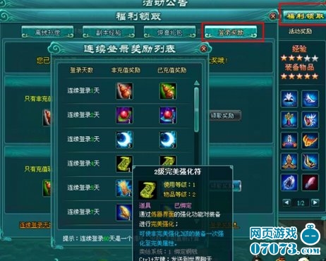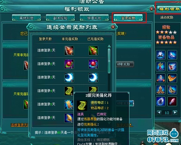 3、连续登陆奖励可以领取,登录的天数越多,可以领取的完美强化符的等级越高。