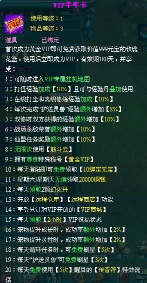 VIP玩家攻略:跟上面攻略一样,任务您可以按自己的情况来刷任务等级,宗门任务可以用元宝购买宗门令来刷新任务,副本诛仙阵,里面神秘层,神秘商人如果有完美强化符,个人建议,购买,会为你强化省很多钱。个人建议购买半年VIP。viP点击背包右侧有个挂机地图,哪里可以挂机,吃个经验丹能比打坐双修快很多。