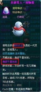 首先看下圣诞雪人的属性:使用后获得801以上资质的灵宠,该灵宠偏向法术属性(就是法术攻击宠物),拥有天赋技能:高级千里冰封。超强的属性,完全和神宠玄冰穷奇看齐,不落一点下风。法术攻击宠物:圣诞雪人,物理攻击宠物:玄冰穷奇,相互辉映,绝对是所有玩家必需的游戏双宠。天赋技能更是有钱也买不到的技能,超越任何技能的存在!