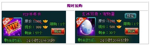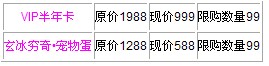 【活动内容】:活动期间,【商城】将限时限量出售珍稀商品——五折【VIP半年卡】,【玄冰穷奇•宠物蛋】,数量有限,先到先得!