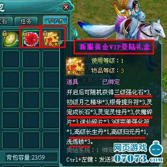 新服黄金VIP登陆礼盒中含有:三级强化石*3,初级月之精华*3,根骨提升符*3,灵宠成长石*3,灵宠灵性丹*3,伏魔碎片*3,诛仙碎片*3,3级完美强化符*1,高级长生丹*1,高级归元丹*1,洗练锁*3.丰厚奖励回报玩家,还犹豫什么,即刻成为黄金VIP获取丰厚福利的新服黄金VIP登陆礼盒吧!