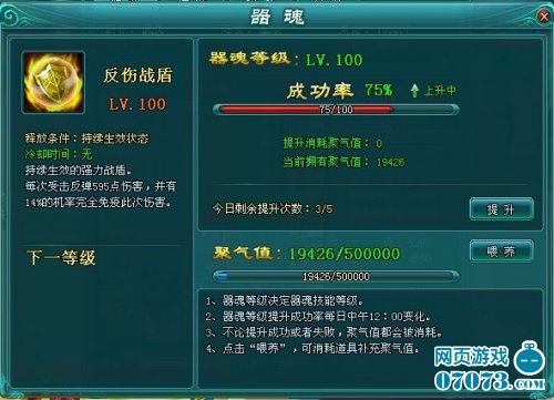 器魂技能等级上限是100级,达到100级后,器魂技能将获得毁天灭地的属性,是玩家60级之后主要的追求点之一。