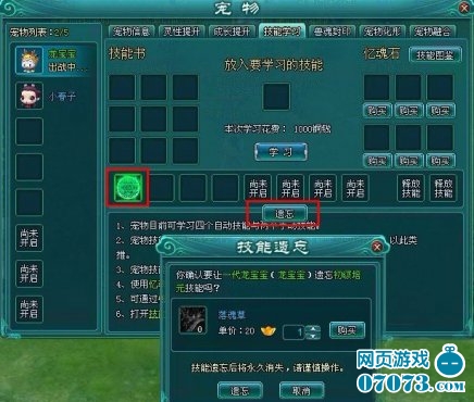 1) 所有灵宠技能都可以遗忘,每次遗忘一个技能需要消耗一个落魄草;