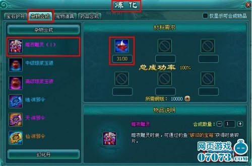 四、开到30个暗夜时装碎片后再打开【炼化】界面-【杂物合成】,然后开始炼化