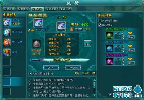 使用进阶材料进阶丹可进阶坐骑,提升坐骑的成长属性,达到七阶、十阶、十二阶时可激活额外的的基础属性。