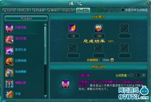 2、炼制需要的材料大概是凤凰羽毛,劳动徽章和坐骑精魄,可以去太机城-黄金梧桐树获得。