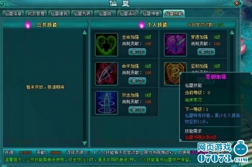 3.仙盟个人技能每提升1级,需要消耗的贡献增加2点;