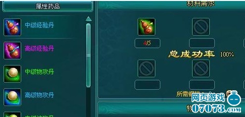 在经验丹下面的添加属性药品只要有2个就可以炼化成为一个中级任意属性丹,任何属性丹药服用后可以增加50点的属性,持续时间为10分钟,中级丹药服用后可以增加100点属性。2个中级丹可以炼化成为1个高级丹,人物服用后可以增加200点属性值。