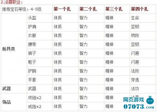凡人修真2宝石镶嵌,是除强化之外,提升装备实力最快的方法,凡人修真2中每件装备可以打三颗宝石,60级装备会自动开启第四个孔,全身装备+7时开启第五个孔,玩家可以镶嵌从“蓬莱仙境”刷到的特性宝石。当然不同的职业,宝石的打法也是不一样的,下面请看官方推荐: