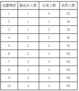 升级仙盟可以增加仙盟人数上限、增加可任命的仙盟官员人数、增加每日福利数额、提升仙盟日常任务和跑商任务获得的仙盟资源奖励、提升仙盟日常任务获得灵石的概率,3级以上仙盟还能额外获得每日福利礼包。仙盟等级与人数上限见下表: