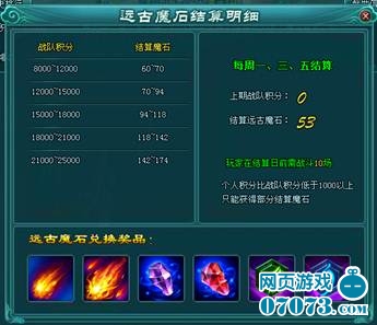 小结:每周一、三、五进行小结,根据战队积分结算成远古魔石,积分越多魔石也越多。这里注意每个玩家需要在结算周期内战斗10场才能参与结算远古魔石。