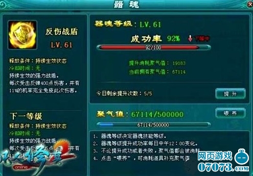 器魂等级决定器魂技能的强弱,这一点告诉我们,器魂是需要补充能量的。在凡人修真2中,玩家可以通过喂养宝石、杂物、护符、药品等提升聚气值,这样便可提升器魂的等级,进而提高器魂技能的杀伤力。