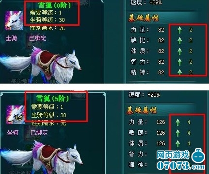 小编和朋友一起做了下对比:如下图所示,相同的30级坐骑,0阶增加各项基础属性为2点,而进阶为5阶的会增加4点。发现不同进阶等级的雪狐转生活获得的基础属性加成是不同的,进阶等级越高增加的越多;