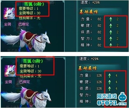 小编和朋友一起做了下对比:如下图所示,相同的30级坐骑,0阶增加各项基础属性为2点,而进阶为5阶的会增加4点。发现不同进阶等级的雪狐转生活获得的基础属性加成是不同的,进阶等级越高增加的越多;