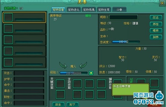 改名功能:玩家可以通过此功能给自己的灵兽命名(不能大于七个字),命名后点击改名即可改成成功
