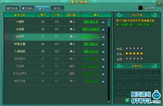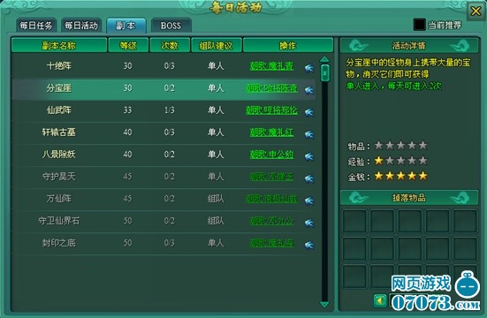 2)副本介绍:副本内容:副本中会有BOSS一个,小怪共分为8种,布在分宝崖副本场中,当所有小怪,BOSS击杀完毕之后,副本完成。