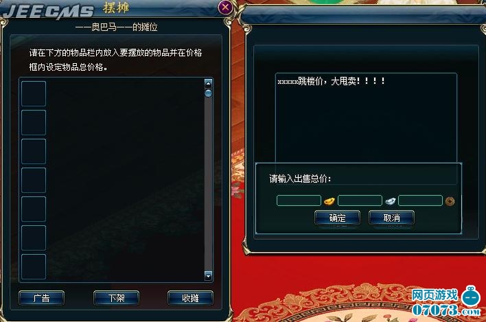 b. 在弹出的窗口中,把你想要出售的物品放在窗口中,系统会自动弹出输入价格的窗口,输入你想出售的价钱即可。另外还可以编写广告词来对你的商品进行简要的说明。