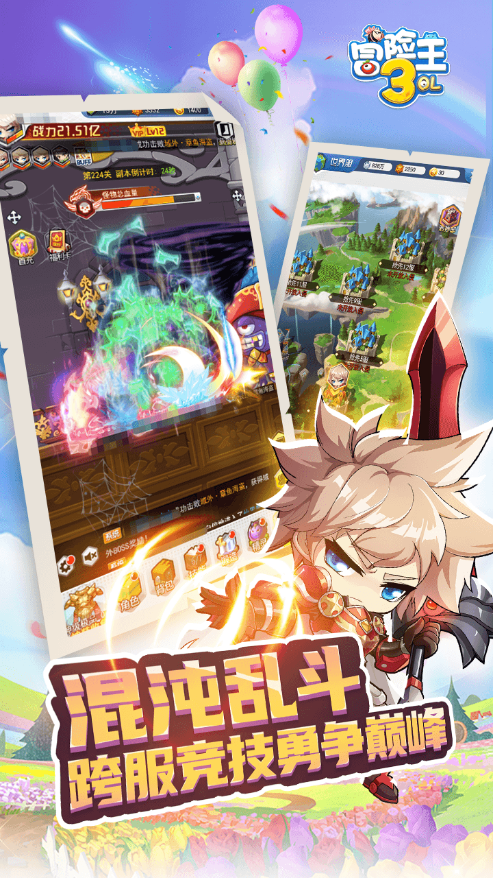 《冒险王3ol手游内购免费版》是一款极其出色的卡通3D横板卷轴类手机游戏,《冒险王3ol无限金币钻石版》游戏继承了前作冒险王2的经典玩法和游戏风格,神级还原了挂机吸怪玩法和Q萌Boss满身神装,更添加了数千种时尚时装可供玩家免费搭配。喜欢的小伙伴快来下载《冒险王3ol手游内购免费版》吧!