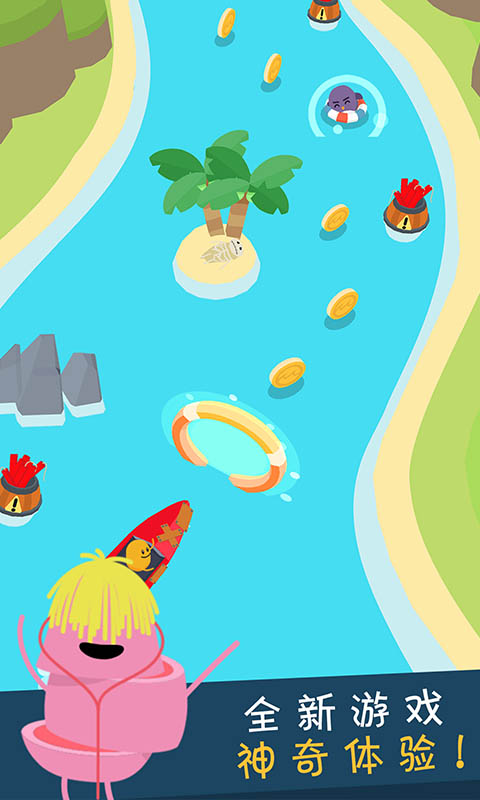 通过摇杆操控小船来获取金币、钻石,以及各种其他物品,期间不能触碰到前方迎面而来的物体。