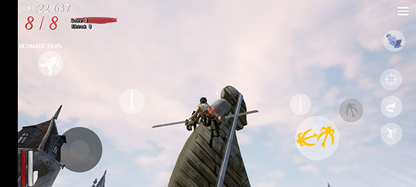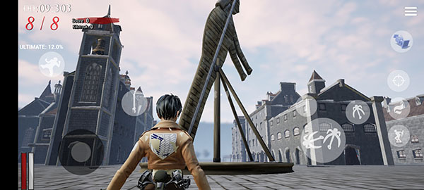 4、使用立体机动装置在空中飞行,并寻找巨人的弱点进行攻击;