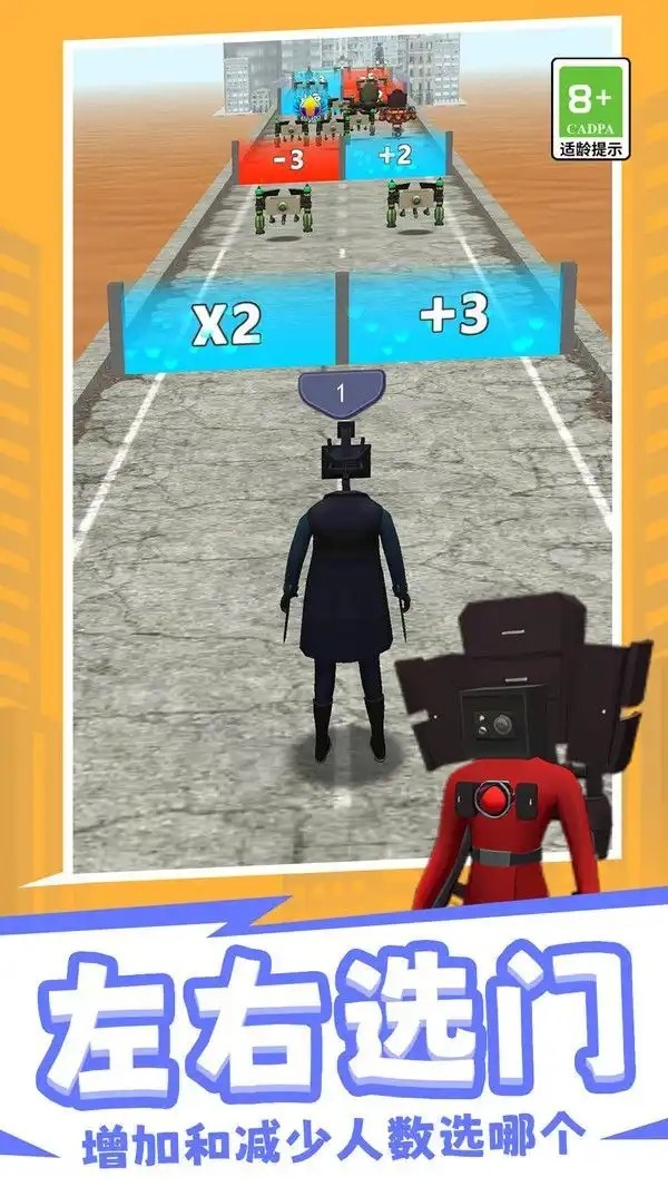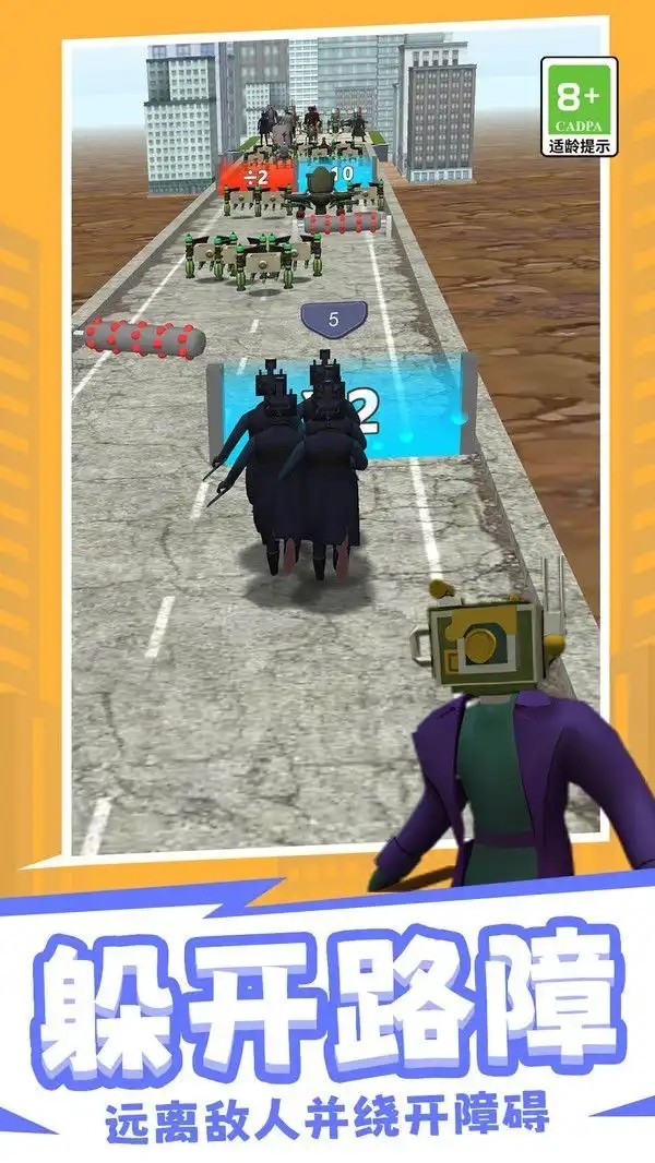马桶人进化决斗是一款热门的跑酷闯关游戏,要顺利的躲开游戏内的路障,远离其中的敌人们,会有许多未知的冒险和挑战在等着您,游戏内还包含左右选门的经典玩法,能够逐渐的提升自己马桶人的数量,得到更为强劲的武器装备,让自己可以处于不败之地!