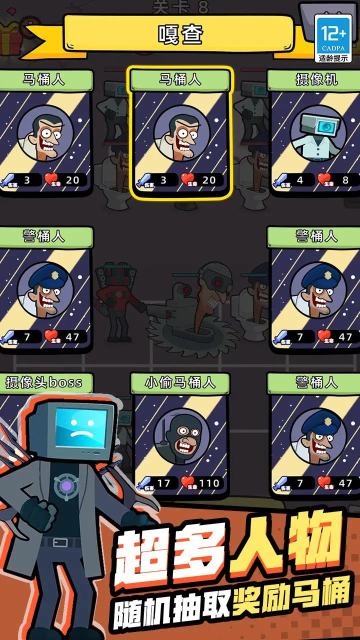 马桶人决战监控人是一款合成战斗类手游,该游戏的操作非常简单,只有不断的合成才能让你在战斗之中获得更多的胜利,诸多的游戏玩法,层出不穷的游戏地图,在线走位非常的轻松,庞大的沙盒世界自由的满足,幽默有趣的音效,激烈的战斗场景,各种各样的攻击和技能助力玩家获取胜利,卡通一般的游戏场景和任务,掌握更大的游戏技巧,战斗就在马桶人决战监控人!