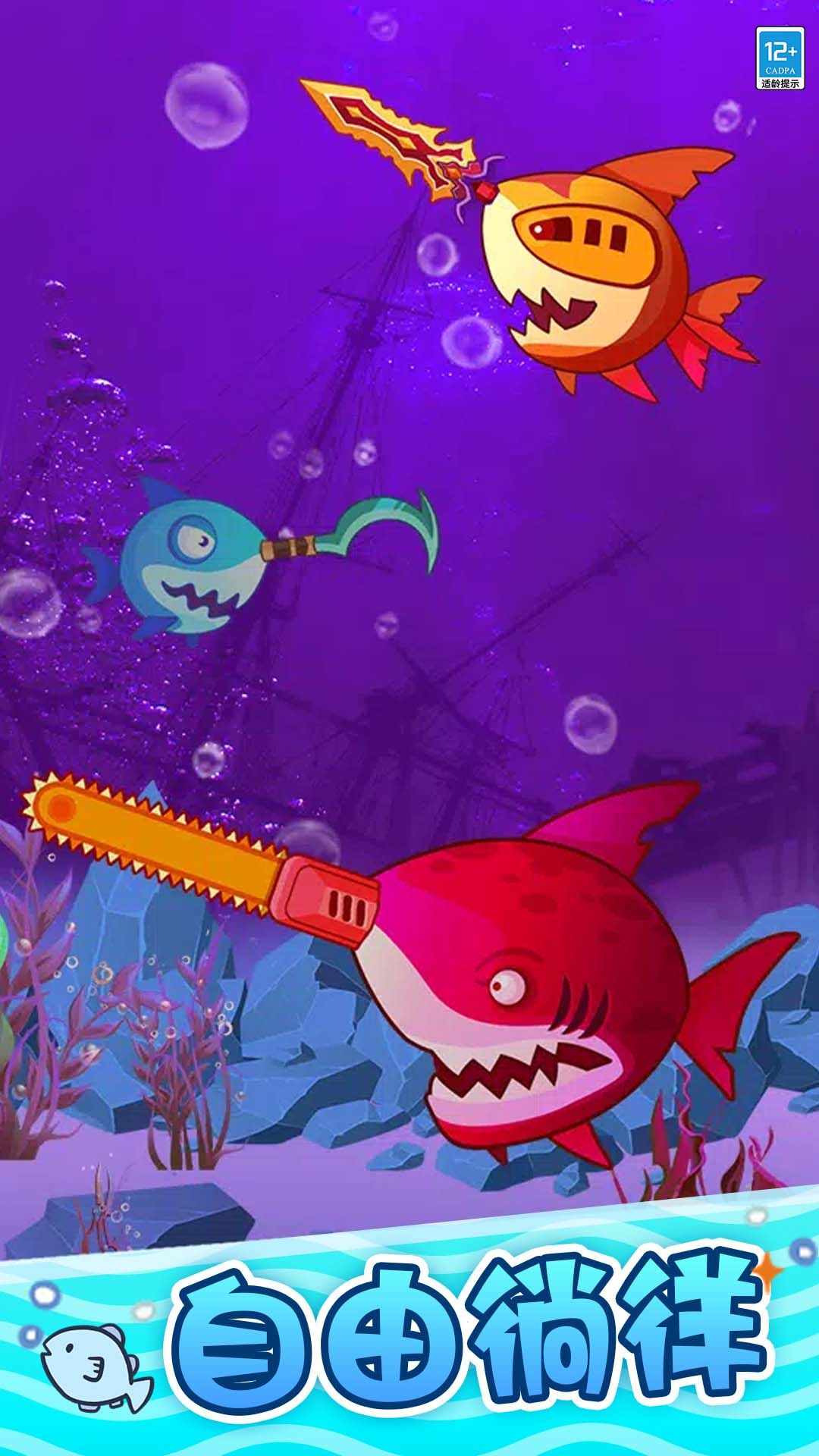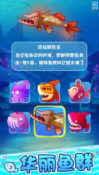 2.通过不断吃小鱼来逐渐成长,每次达到一定等级就可以解锁新的鱼形态。